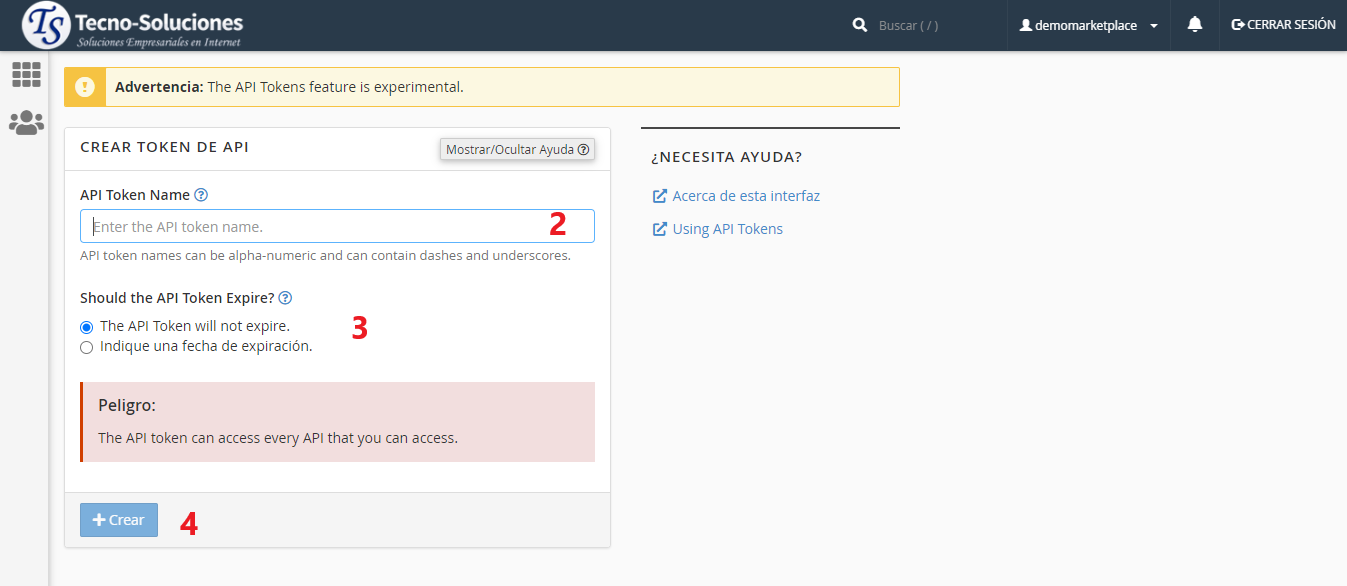 - El token de API no caducará. – Esto creará un token que no tiene fecha de vencimiento.