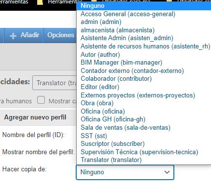 Esta opción nos permite copiar las funciones permitidas de otro rol ya creado. Al darle clic en la caja de selección nos despliega todas las opciones creadas.