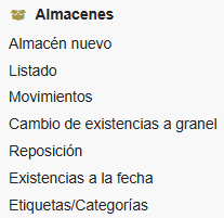 Este submenú lateral Izquierdo dentro del módulo Productos / Servicios, contiene los accesos para las tareas asociadas con los Almacenes.