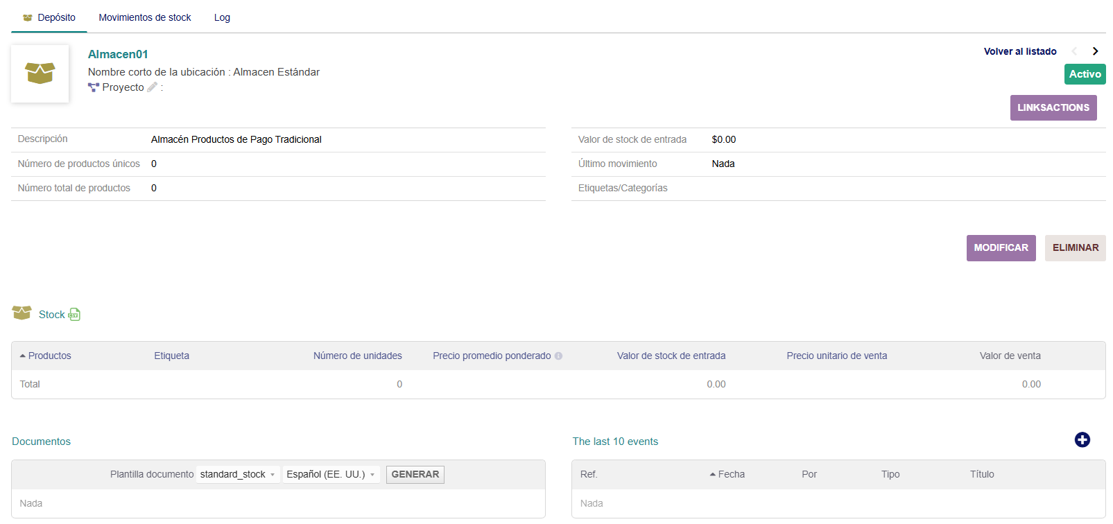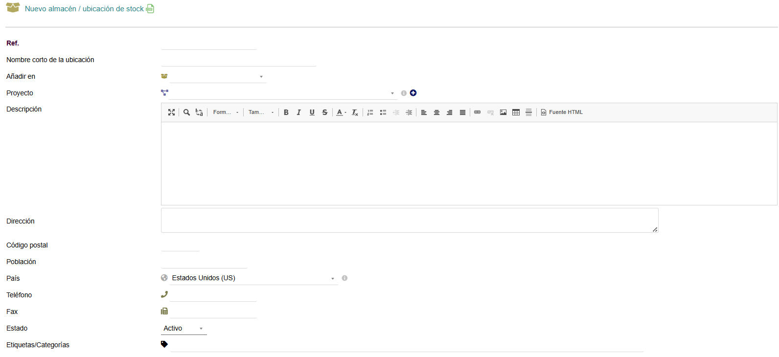 En Estado, si se selecciona “Activo” significa que podemos almacenar productos en él, pero si lo colocamos “Cerrado”, no podemos almacenar nada en él.