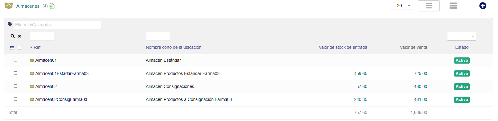 - Almacén nuevo: permite crear un Almacén con su ubicación de stock y consiste en completar el formulario correspondiente. Un almacén puede crearse como dependiente de otro, estableciendo un orden jerárquico. Por ejemplo, se puede crear un almacén de Producción y varios subAlmacenes relacionados. También se puede asociar el Almacén a una Categoría de Almacenes (que debe estar previamente configurada).