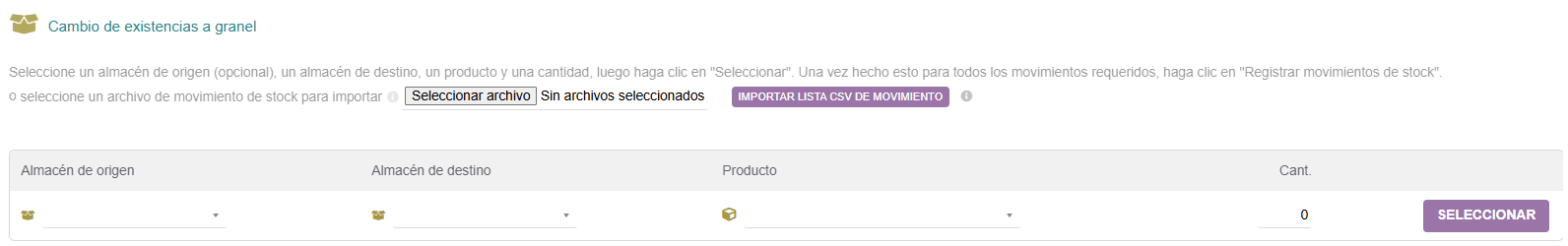 - Cambio de existencias a granel: con esta opción podremos realizar transferencias de varios productos entre almacenes, además de que podremos leer el conjunto de transferencias a partir de un archivo.