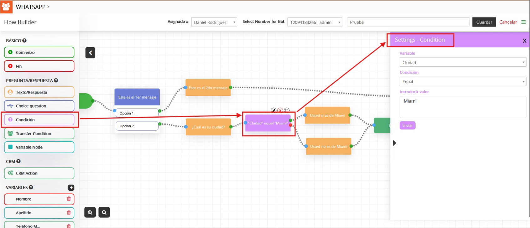 Los usuarios también pueden establecer condiciones tanto para ‘Y’ como para ‘O’ en el chatbot, lo que permite una lógica más flexible para evaluar múltiples condiciones y activar acciones específicas en función de esos criterios.