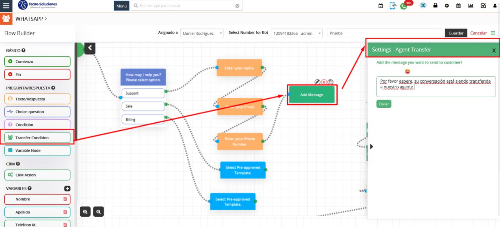 Esta función permite que el sistema asigne un agente específico para manejar la conversación cuando el bot llega a este nodo.