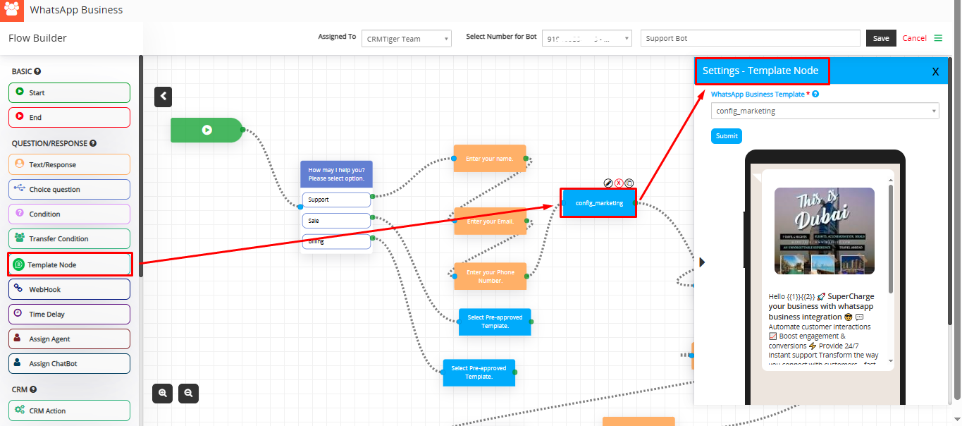 Seleccionar plantilla de WhatsApp Business preaprobada: Puede seleccionar una plantilla de WhatsApp Business preaprobada de la lista.