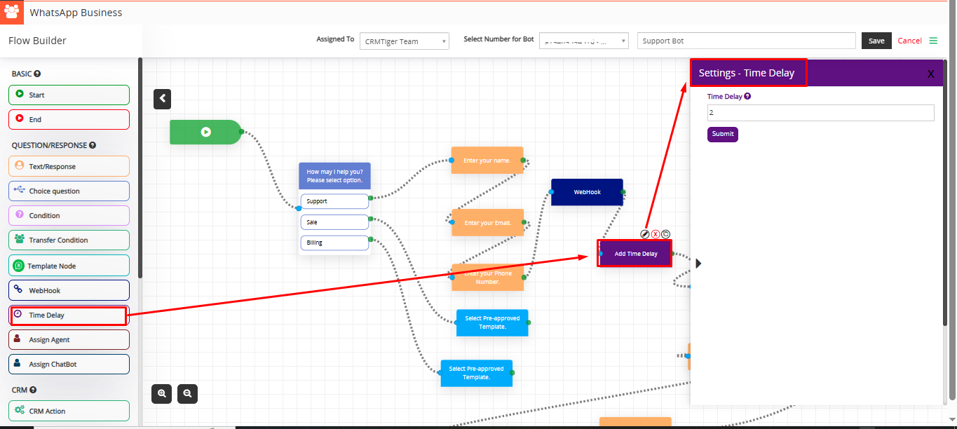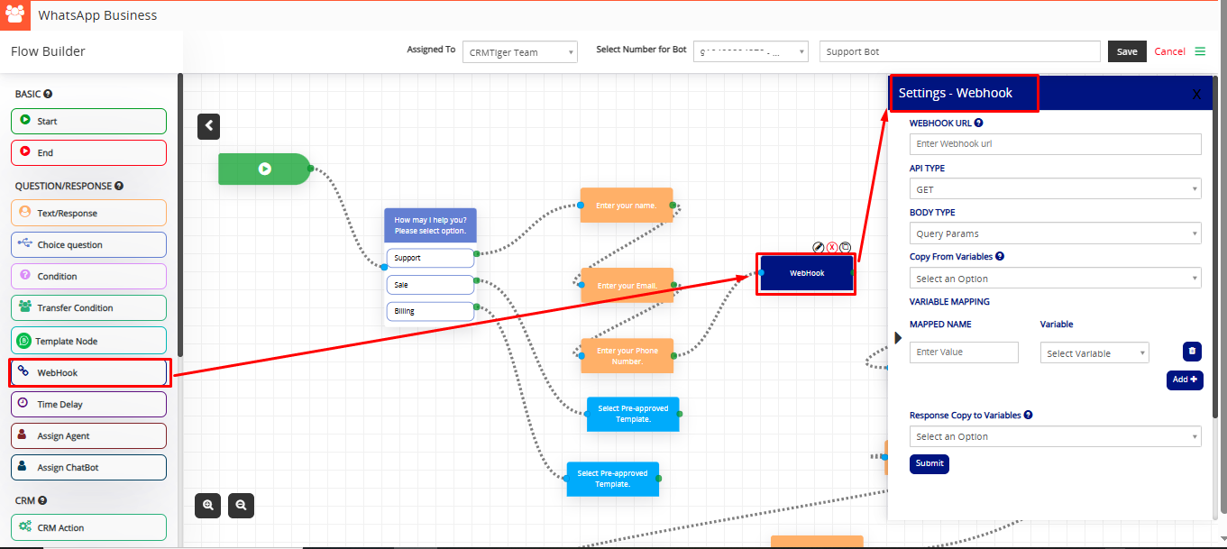 - Copia de respuesta a variable: copia la respuesta del cliente a la pregunta del bot a una variable que puede usarse para almacenar en CRM o responder al cliente en varias etapas del flujo del bot.
