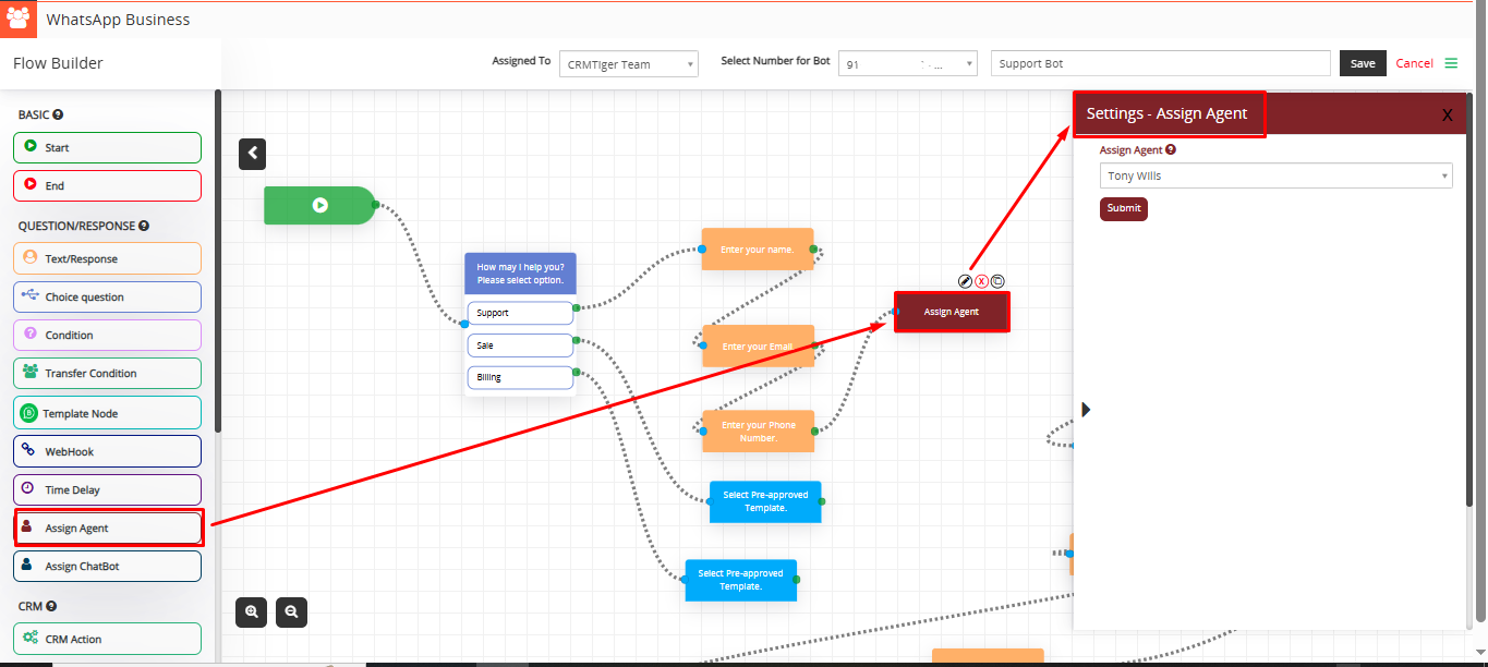 Nota: Solo los agentes asignados a través de su configuración de WhatsApp estarán disponibles para su selección.