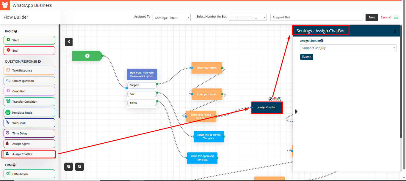 Con esta función, los usuarios pueden configurar varios tipos de preguntas en el flujo para preguntar a los clientes. Agregue una condición para compararla con una respuesta de un cliente en un bot.