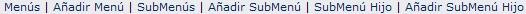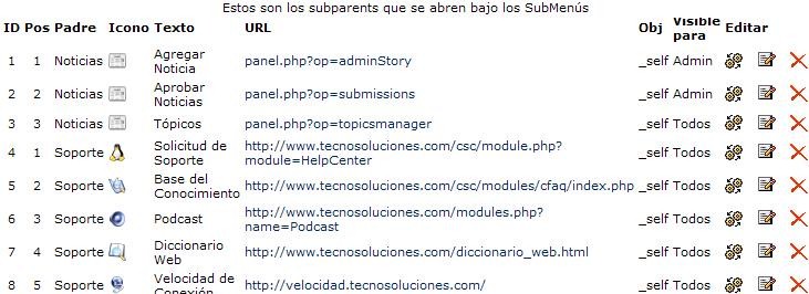 Submenús: Muestra el listado de los nombres configurados como submenús con las características de cada uno (Estado, Padre al que pertenece, Icono, Texto del Link, URL a donde se dirige el submenú, si posee SubParent, posibilidad de editarlo / eliminarlo, entre otros). Ejemplo: