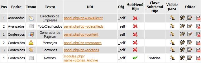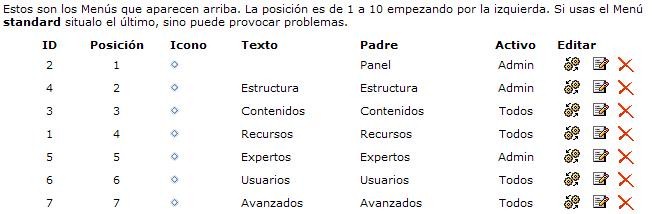 Menús: Muestra el listado de los nombres principales que aparecen en el menú, junto con la posición, icono (imagen asociada), texto que aparecerá publicado (Título Principal), Padre (Parent) al cual pertenece (nombre referencia para los SubMenús), para quiénes estará visible, si está activo o no y la posibilidad de editarlos o eliminarlos.