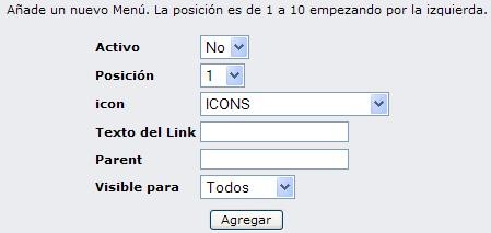 Añadir Menú: Para agregar un nombre en el menú principal (Título Principal), solo debe llenar el formulario respectivo, donde debe indicar si va a estar activo o no, la posición (si es “1” el nombre aparecerá de primero a la izquierda del menú), seleccionar la imagen asociada (Icon), colocar el nombre (texto del Link), el código de referencia del menú (Ejemplo de Padre (Parent): Estructura, Contenidos, Recursos…, etc.), y para quienes estará visible.