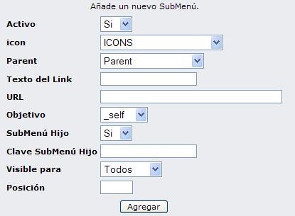 Añadir Subparent / SubMenú Hijo: Es muy similar al anterior, solo se debe tener en cuenta la selección del Subparent (submenú) al cual pertenece.