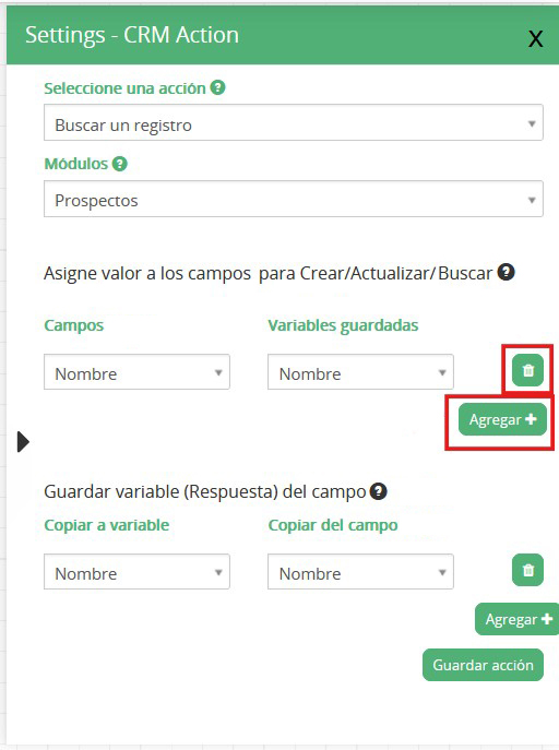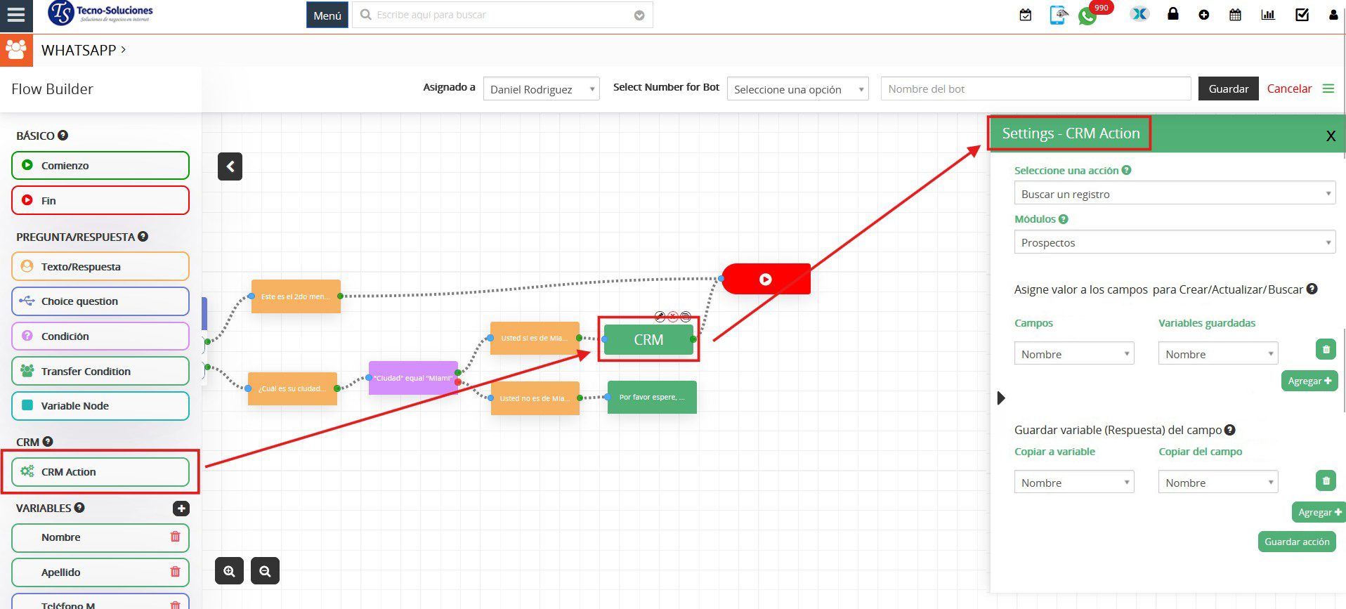 - Guardar variable (Respuesta) del campo CRM: al crear/buscar en TecnoCRM, devolverá el valor del campo seleccionado al cliente para que se muestre en el bot de WhatsApp Business.