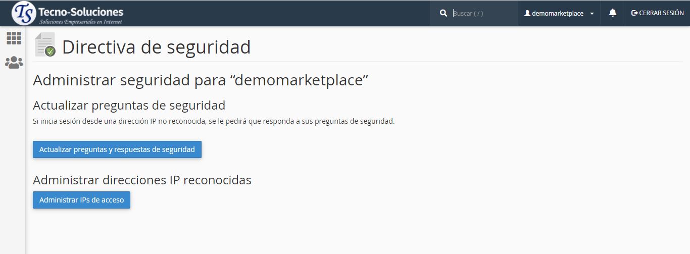 rootcontraseña del servidor para iniciar sesión en una cuenta de cPanel, no puede actualizar las preguntas y respuestas de seguridad. En su lugar, haga clic en Restablecer preguntas y respuestas de seguridad . El sistema solicitará al usuario de la cuenta de cPanel que actualice las preguntas y respuestas de seguridad en el próximo inicio de sesión.Administrar direcciones IP reconocidas