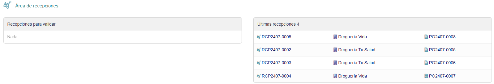 Este submenú permite consultar y administrar las recepciones que se hayan generado a partir de las órdenes de compra a proveedores.