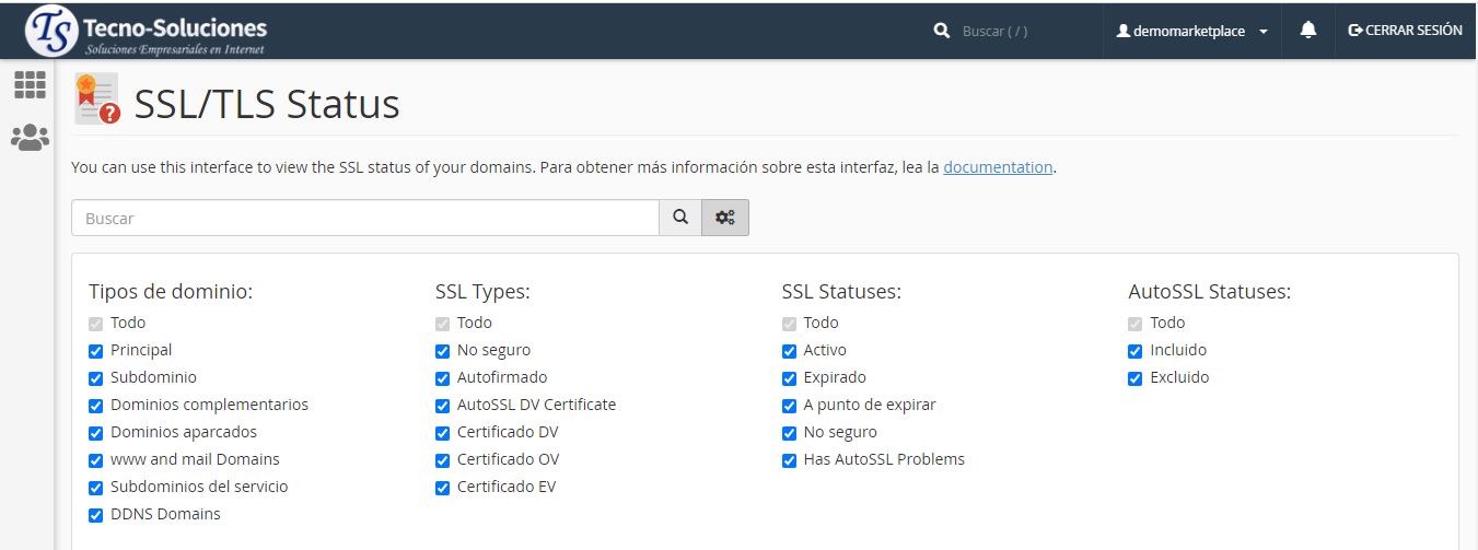 - Todo : muestra todos los dominios, independientemente del estado de AutoSSL. Este es el filtro de búsqueda predeterminado.