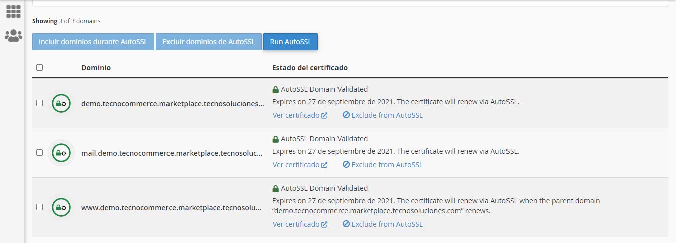 - Incluido : muestra los dominios que AutoSSL incluye cuando se ejecuta.