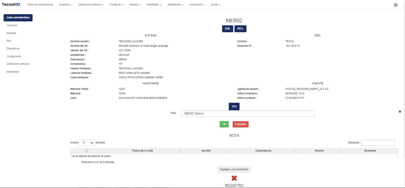 - Sección especial Datos administrativos: utilice esta sección para mostrar los datos administrativos del dispositivo. Esta página encaja con su configuración en la pestaña “admininfo”. Utilice el botón “actualizar” para cambiar los valores.