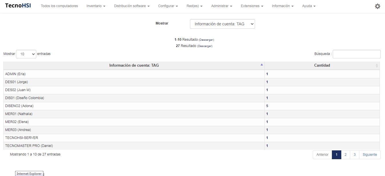 Esta consulta le permite mostrar todas las máquinas agrupadas por información de TAG de la cuenta. Haga clic en el recuento de la computadora para recuperar los dispositivos correspondientes.