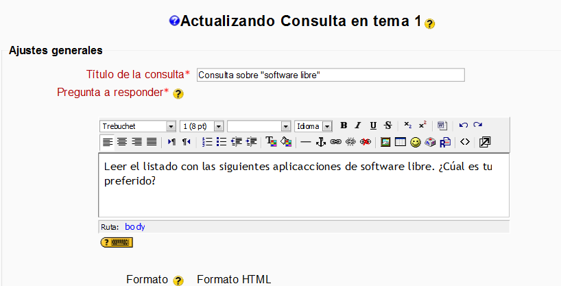 - Título: es el nombre con el que aparecerá identificada la Consulta en la página principal del curso. Se pueden incluir marcas HTML para lograr efectos de estilo en el texto.