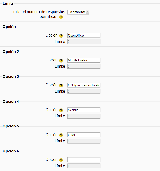 - Opciones: son las opciones de respuesta posibles a la pregunta planteada. En principio, tenemos 10 opciones. Las opciones en blanco no se presentarán. A continuación el formulario de configuración muestra una serie de parámetros para personalizar el comportamiento de la consulta.