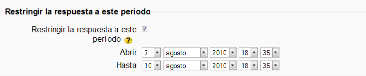 - Restringir la respuesta a este periodo: permite especificar un periodo concreto para realizar la votación. Pasado el plazo no se podrán marcar opciones. Si necesita una consulta permanentemente abierta, fije un plazo muy distante en el tiempo.