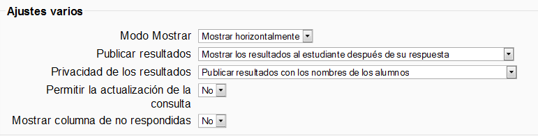 - Privacidad de los resultados: determina si los resultados mostrados a los estudiantes indicarán no sólo los resultados acumulados por opción, sino qué opción escogió cada uno. Estos datos siempre están disponibles para el profesor.