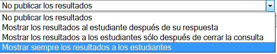 - Mostrar sólo después de cerrar la consulta: los resultados sólo se muestran a los estudiantes después de que la consulta se ha cerrado (han votado todos o ha finalizado el plazo hábil).