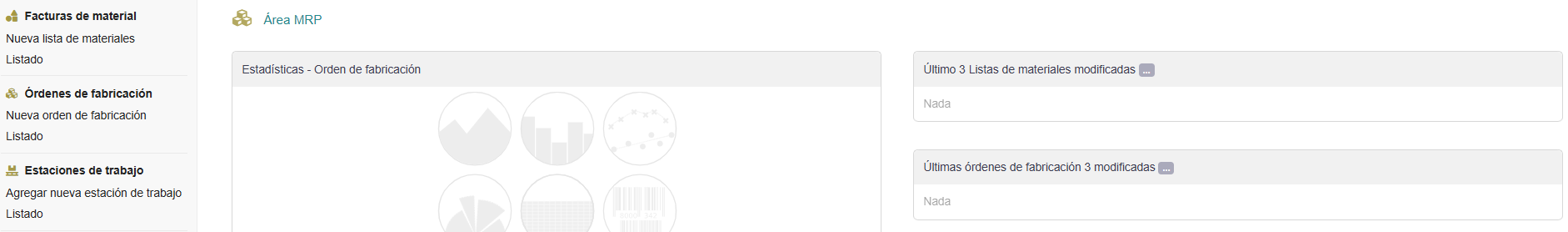 El módulo de fabricación está disponible bajo la pestaña MRP (Manufacturing Resource Planning), en la cual podremos ver la siguiente pantalla: