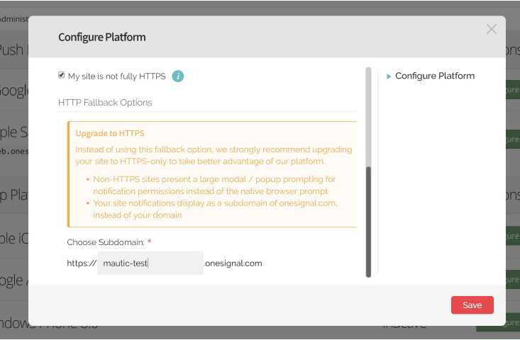 Le recomendamos utilizar https en sus sitios web. Pero el soporte de http para onesignal.com es muy similar a https, en la actualidad. Solo debe usar las opciones de subdominio en onesignal.com y en su TecnoMatic.