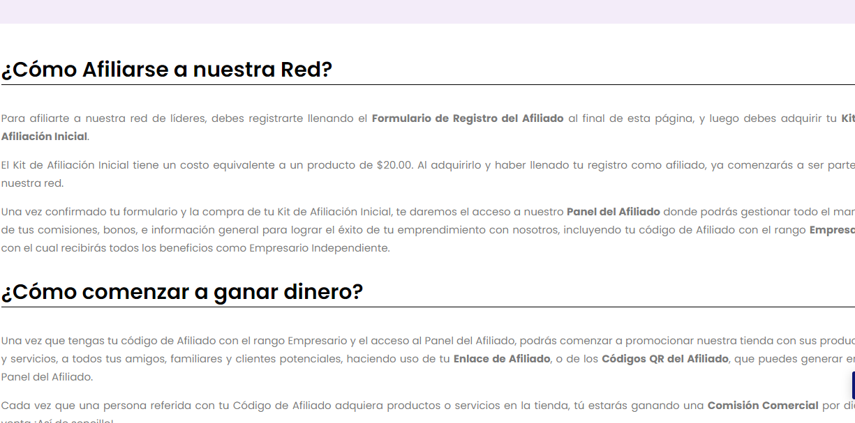 Posteriormente, se le mostrará una página donde explica el modelo de negocio del programa de afiliados. Se recomienda leerlo para entender perfectamente el modelo de comisiones y bonos.