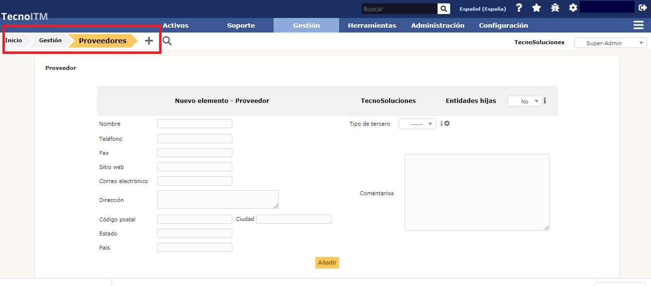 TECNOITM integra la gestión de proveedores, que es diferente de la de los fabricantes (consulte Configuración de etiquetas). Esto se usa tanto para identificar quién vendió un material (en la gestión de la flota) como para asignar peticiones a esta persona o empresa.