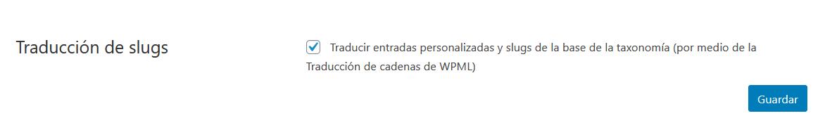 La versión 4.0 de WPML presentó la posibilidad de traducir también los slugs base para las taxonomías personalizadas. Para habilitar esta función, diríjase WPML > Ajustes. Allí, debe desplazarse a la sección Traducciones de slugs y verificar que esté activada la opción para traducir entradas personalizadas y slugs base de taxonomías.