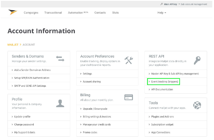 - Inicie sesión en su cuenta de Mailjet y vaya a Mi cuenta > Seguimiento de eventos (activadores)