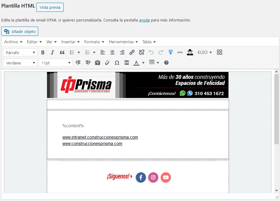 Es importante que en el centro de nuestro diseño se encuentre la palabra reservada %content%. Esta palabra tiene la funcionalidad de ser el ancla del contenido entro del email.