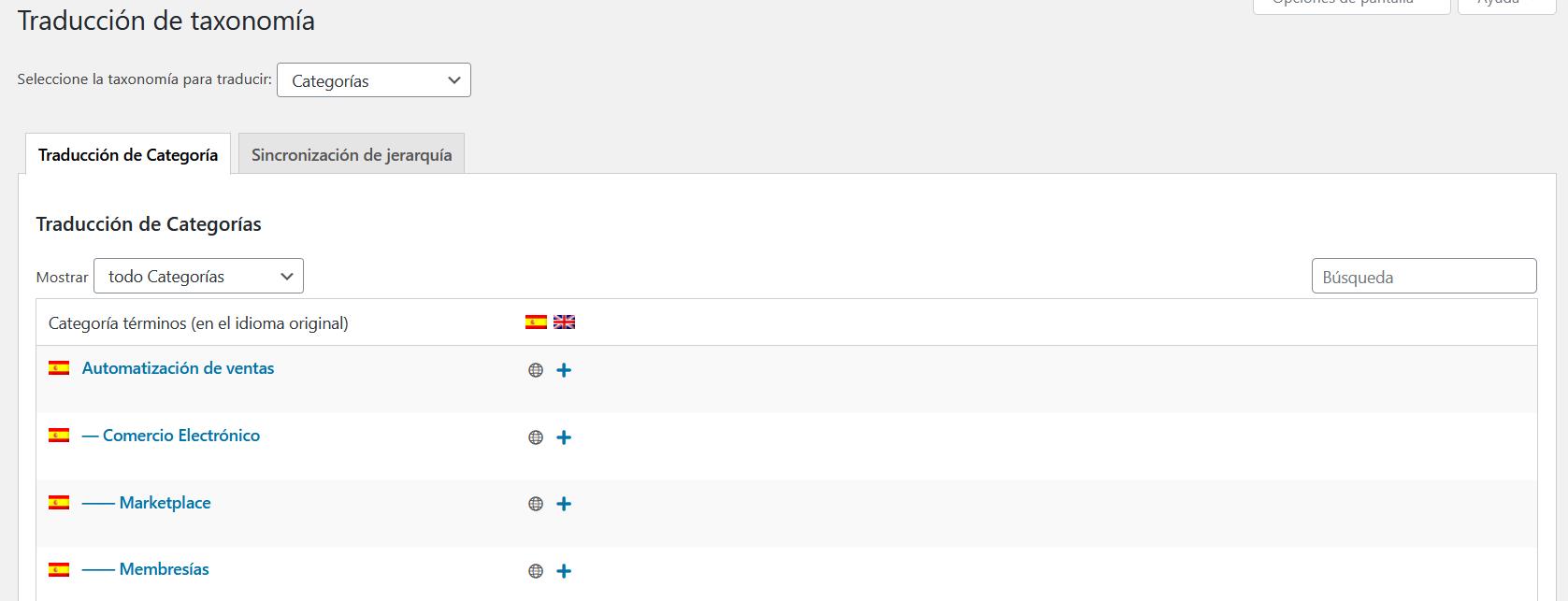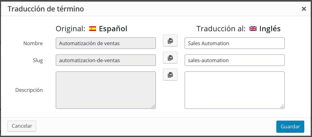 Una vez seleccionada esta opción, podrá traducir los términos de las taxonomías y las etiquetas para las mismas. Los términos son las verdaderas etiquetas y categorías en su sitio. Las etiquetas muestran cómo aparecen en el sitio los nombres de las taxonomías.