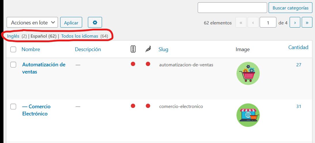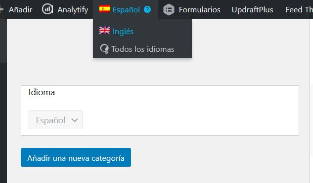 Para cambiar el idioma de nuevas categorías, debe seleccionar aquel que desea en la barra de admin: