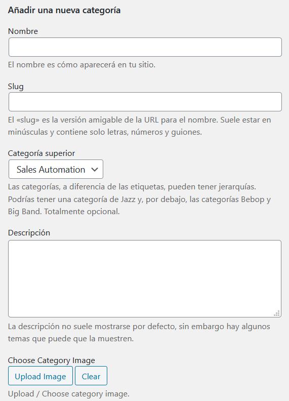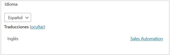 Haga clic en el nombre de la categoría que desee traducir, por ejemplo «Automatización de Ventas». Esto lo dirigirá a la página «Editar categoría» para «Automatización de Ventas». En la parte inferior de la página, podrá ver: