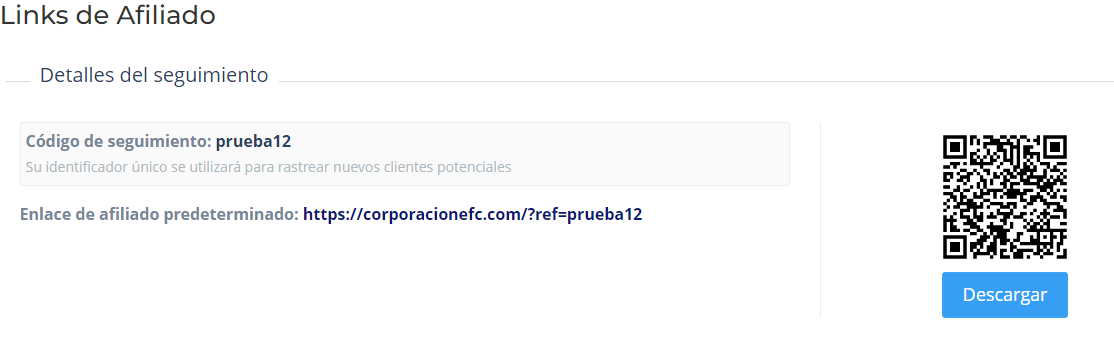 - Links de afiliado: A través de esta vista el afiliado podrá compartir su código de afiliado, pudiendo así compartir su enlace de afiliado para crear su propia red. También tiene a su disposición la generación de un código QR para compartir su código de una manera práctica.