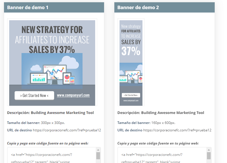 - Banners o creatividades: Le permitirán promocionar su código de afiliado a través de banners con diseños llamativos. Estos banners son predefinidos por el administrador de la plataforma y usted podrá insertar el código HTML generado en algún sitio web externo.
