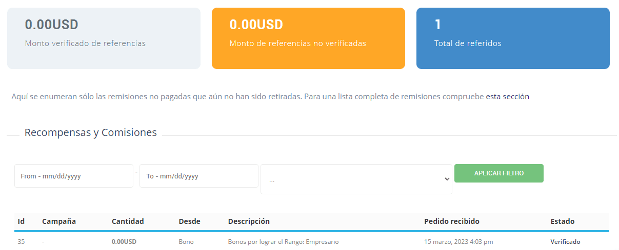 En el menú de “Referidos” se enumeran sólo las remisiones no pagadas que aún no han sido retiradas. Esto quiere decir que vamos a poder visualizar todas las transacciones relacionadas con: comisiones directas, comisiones indirectas, comisiones por nuevos afiliados y bonos por subir de rango.