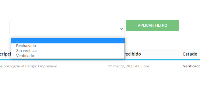 Adicionalmente, usted podrá filtrar por diferentes estados: Rechazado, sin verificar y verificado.