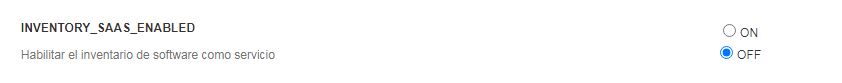 Para activar el Inventario de aplicaciones web, vaya a Configuración > Configuración general y haga clic en la entrada Inventario en el panel de navegación izquierdo. En la parte inferior de la página, haga clic en ON para INVENTORY_SAAS_ENABLED.