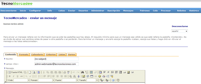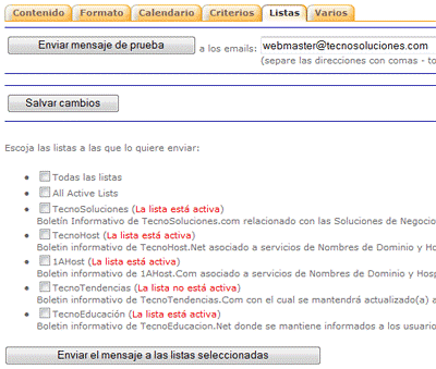 TecnoMercadeo le permite enviar mensajes por correo electrónico a la(s) lista(s) de los usuarios. Para ello dispone de diversas pestañas. Para enviar un mensaje se debe completar la información que se pide en dichas pestañas. El requisito mínimo para que un mensaje sea válido es que esté completado lo correspondiente a la pestaña “Contenido”. No se olvide de Salvar sus Cambios antes de pasar a otra pestaña o se perderán. Para terminar un mensaje y enviarlo escoja la pestaña “Listas”, seleccione entonces sus listas y luego haga clic en “Enviar el mensaje a las listas seleccionadas”. A continuación se explican cada una de las pestañas disponibles: