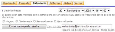 A su vez, puede crear patrones para los mensajes que se envían con elementos RSS. Para ello haga clic en la pestaña “Calendario” e indique la frecuencia del mensaje. El mensaje se utilizará para enviar la lista de elementos a aquellos usuarios de las listas que hayan escogido esta frecuencia. Debe utilizar el marcador [RSS] en su mensaje para indicar el lugar en el que irá la lista de elementos.