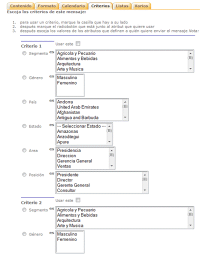 Criterios: Dependiendo de la configuración de su sistema, puede utilizar el proceso de selección de criterios. La elección de los criterios es importante si desea llegar a la audiencia adecuada para el mensaje. En esta pestaña podrá segmentar la lista en base a criterios que usted designe (Ejemplo: enviar mensajes personas del género femenino que vivan en el estado Aragua).