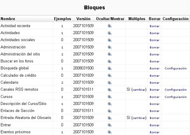 Ubicación: Administración> Módulos > Bloques> Gestionar bloques