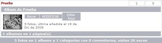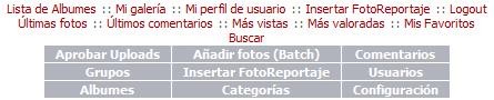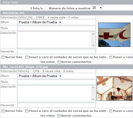 - Editar / Eliminar Fotografías / Álbumes: Cada fotografía en forma independiente posee opciones de Editar y Borrar. A su vez, cuando se visualiza la Lista de Álbumes aparece, al lado de la fotografía del álbum correspondiente, tres imágenes: dos que permiten Borrar / Editar el álbum () y otra para Editar las fotografías incluidas en el álbum seleccionado (). Al hacer clic en esta última, se muestra un listado de las fotografías y, por cada una, el formulario para su edición con opciones de borrar y poner en cero los contadores que miden las veces vista, los votos y los comentarios; por ejemplo: