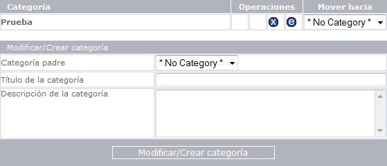 - Categorías: Permite actualizar / crear una categoría, colocándole el nombre y una breve descripción. Además, muestra una tabla con todas las categorías creadas con opciones de Operaciones y Mover. Tal como se muestra en el ejemplo general a continuación: