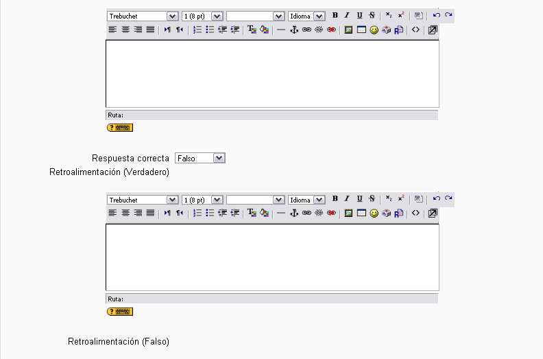 Si se habilita la retroalimentación, entonces el mensaje de retroalimentación se muestra al alumno después de contestar el cuestionario. Por ejemplo, si la respuesta correcta es “Falso”, pero se contestó “Verdadero” (por lo tanto incorrecto) entonces se muestra la retroalimentación “Falso”.